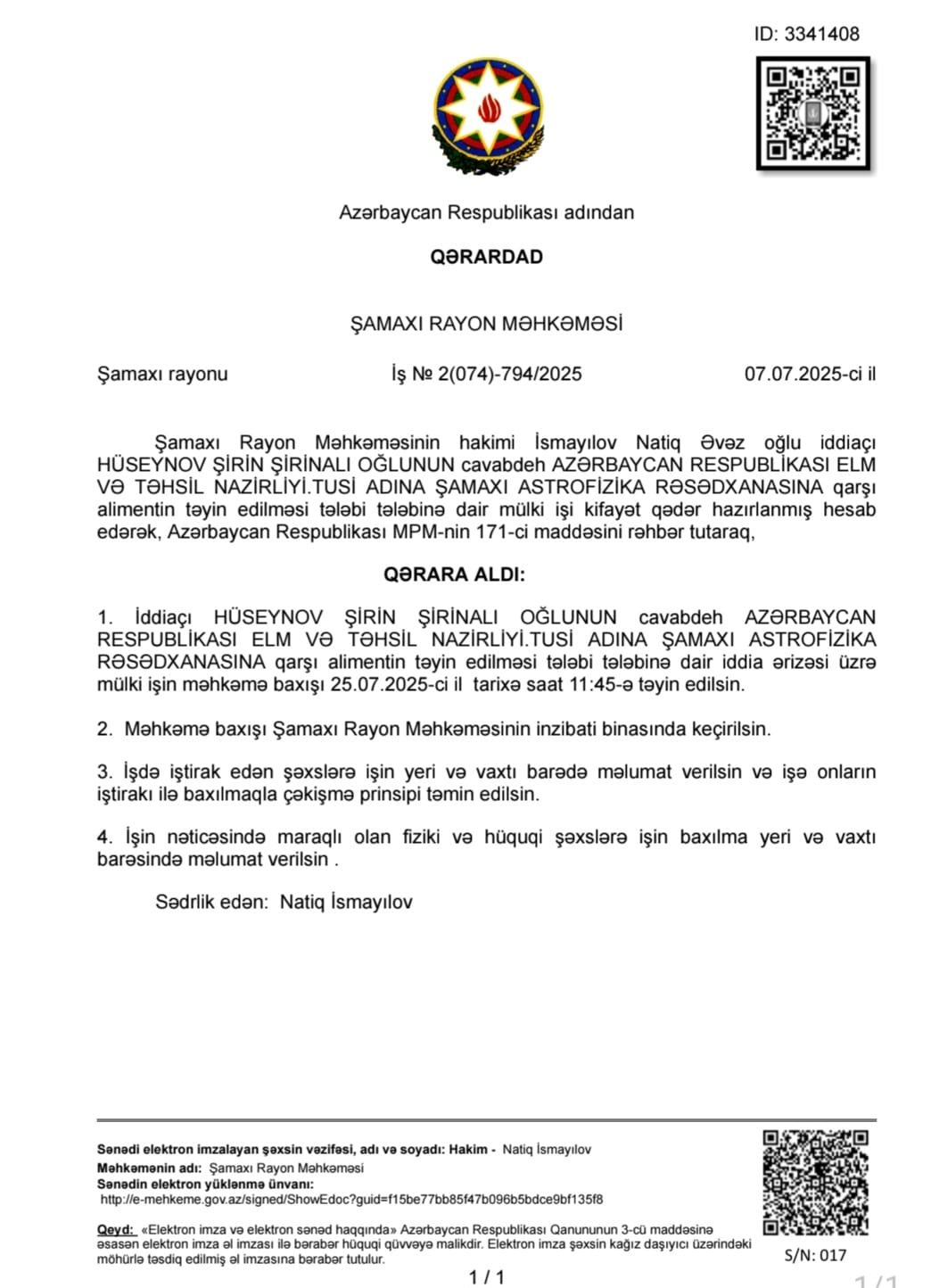 Şamaxı Rayon Məhkəməsinin hakimi Natiq İsmayılov, təbiət elmləri ilə məşğul olan bir elm müəssisəsini aliment məsələsində cavabdeh etməklə, “mülki hüququn orbitini” yerindən oynadıb. Qərarda yazılıb ki, cavabdeh – yəni “Azərbaycan Respublikası Elm və Təhsil Nazirliyi – Tusi adına Şamaxı Astrofizika Rəsədxanası” – 25 iyul 2025-ci ildə məhkəmə qarşısına çıxmalı və... uşaq baxımı ilə bağlı hesabat verməlidir.