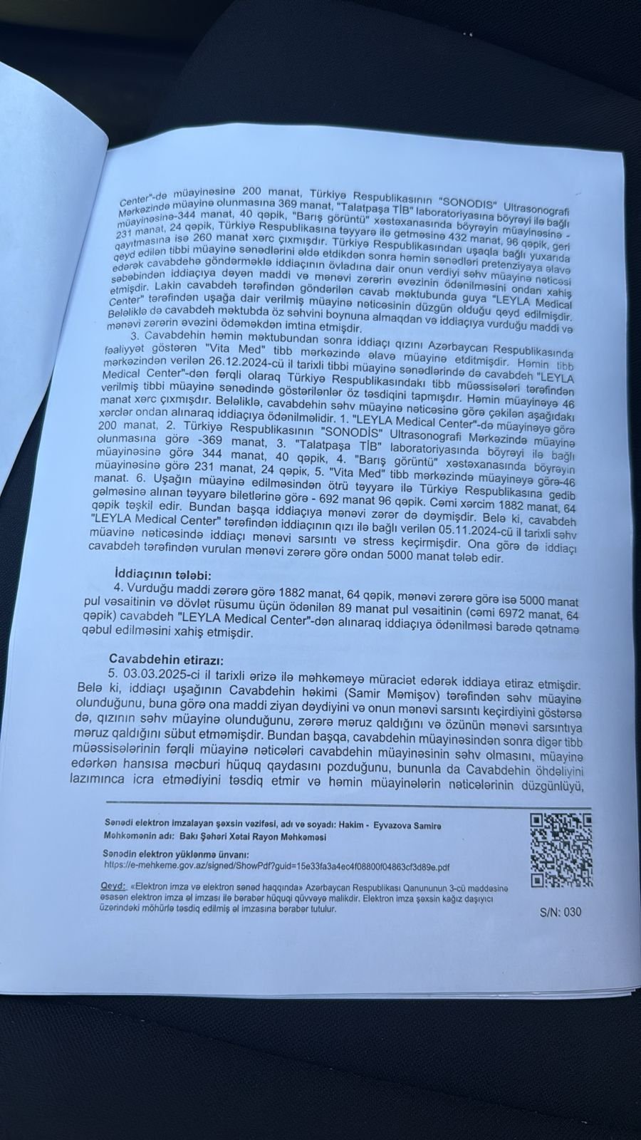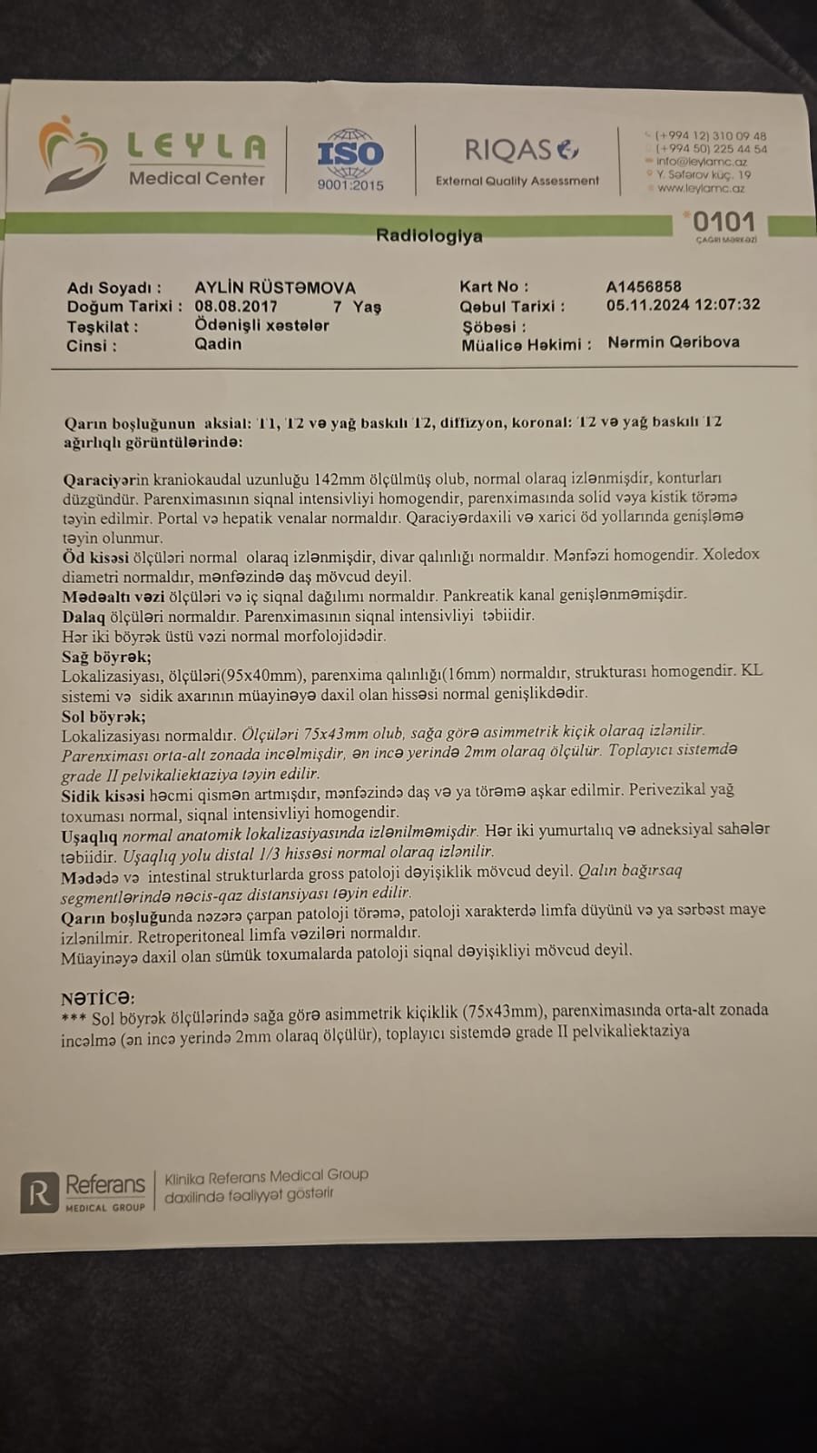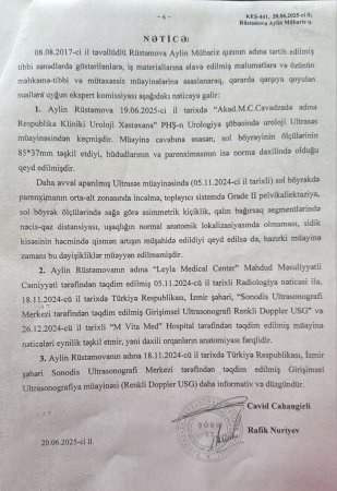 “2024-cü il noyabrın 5-də Leyla Medikal Klinikasında radioloq Samir Məmişovun yanında müayinədə olduq. Həkim bildirdi ki, övladım qüsurludur. Yəni onun anadangəlmə uşaqlığı yoxdur, bədəndə tam inkişaf getməyib. Eyni zamanda böyrəklərində və bağırsaqlarında problemin olduğunu və sidik kisəsinin altında törəmələrin olduğunu bildirdilər. Uzun sözün qısası uşağın bütün orqanlarının sıradan çıxdığını və pis vəziyyətdə olduğunu dedilər”.