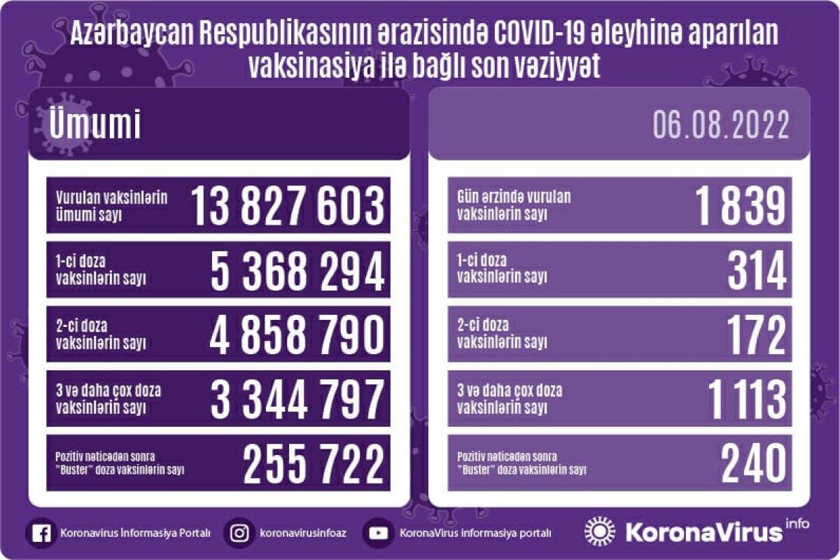 Qeyd edilir ki, vurulan peyvəndlərin ümumi sayı 13 827 603, birinci mərhələ üzrə vaksinasiya olunanların ümumi sayı 5 368 294, ikinci mərhələ üzrə vaksinasiya olunanların sayı 4 858 790, üç və daha çox doza üzrə vaksinasiya olunanların sayı 3 344 797, pozitiv nəticədən sonra buster doza üzrə vaksinasiya olunanların sayı isə 255 722 nəfərdir.