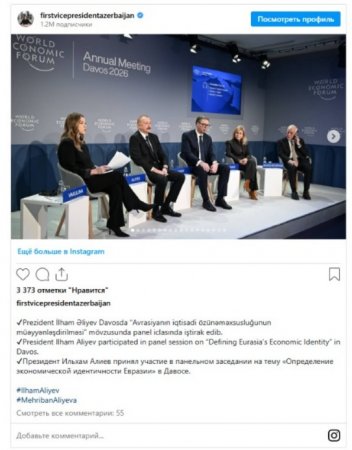 Azərbaycan Respublikasının Birinci vitse-prezidenti Mehriban Əliyeva sosial şəbəkə hesabında Prezident İlham Əliyevin Davosda "Avrasiyanın iqtisadi özünəməxsusluğunun müəyyənləşdirilməsi" mövzusunda panel iclasında iştirakı ilə bağlı paylaşım edib.